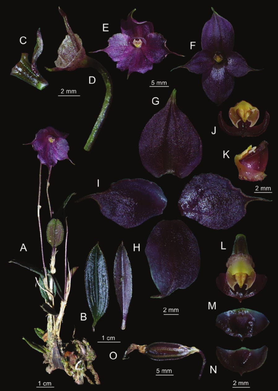 New species recently described including a beautiful deep purple Brachionidium orchid (see below) and a species of Polylepis